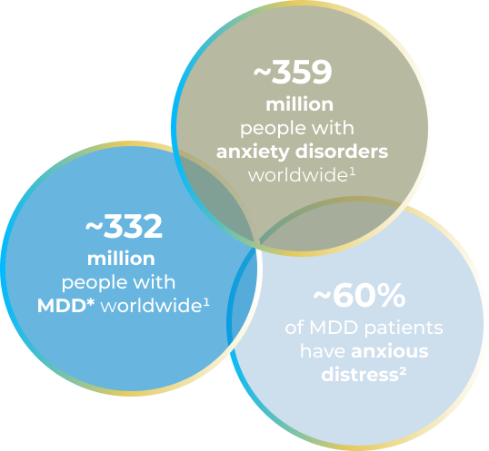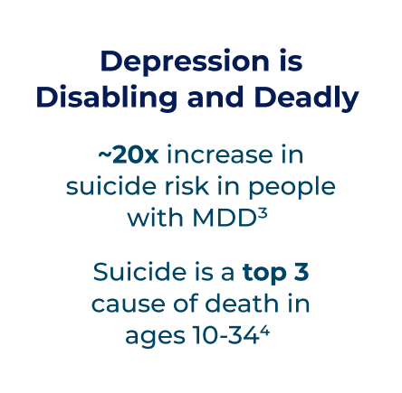1. Mental disorders; World Health Organization, 2022; 2. Kessler et al., 2015. Anxious and non-anxious major depressive disorder in the World Health Organization World Mental Health Surveys. Epidemiol Psychiatr Sci. 2015; 2. American Association of Suicidology, 2009; *MDD = Major Depressive Disorder; 3. Suicide Data and Statistics | Suicide Prevention | CDC. (n.d.). https://www.cdc.gov/suicide/suicide-data-statistics.html